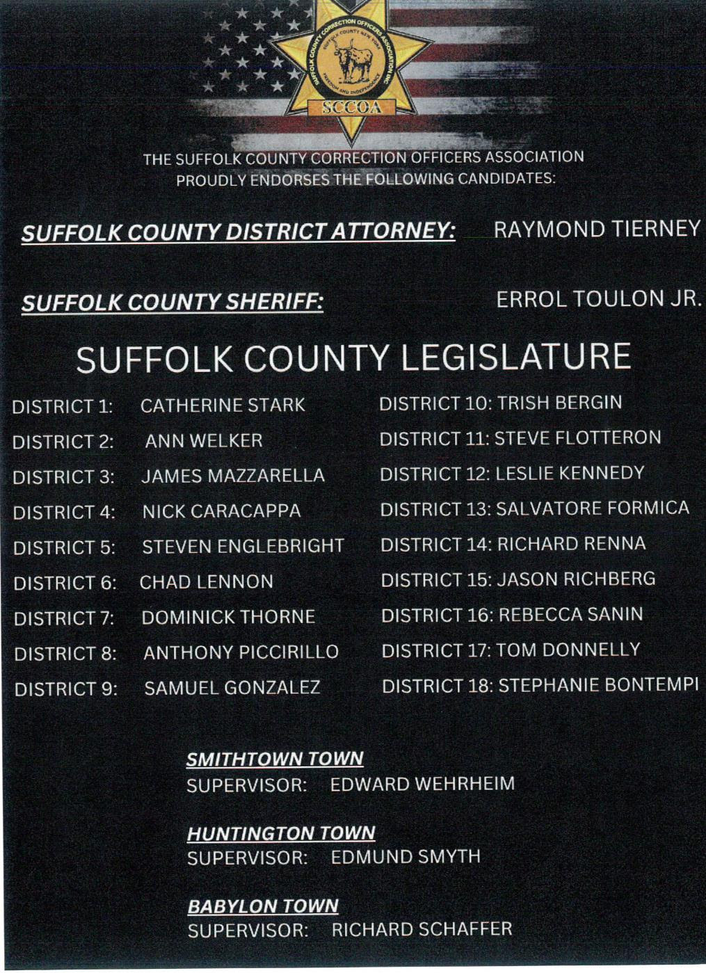 Please see below the list of political endorsements from the Suffolk County Correction Union. We kindly asking our Nassau COBA members who reside in Suffolk County to please support these candidates on Election Day and in Early Voting.