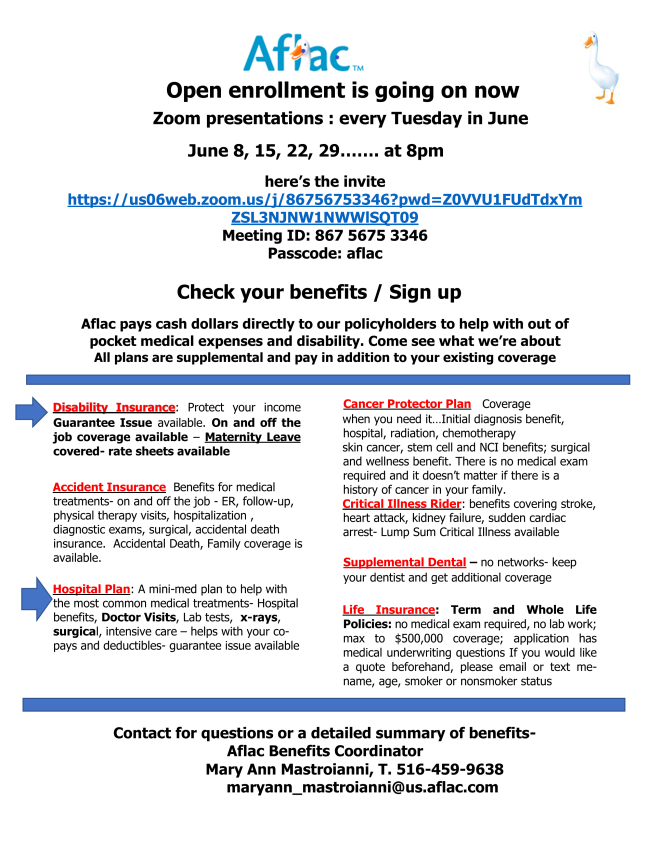 Aflac is having Zoom meetings this year - every Tuesday night in June at 8pm. All information is on the attached flyer. For your convenience the link is here: