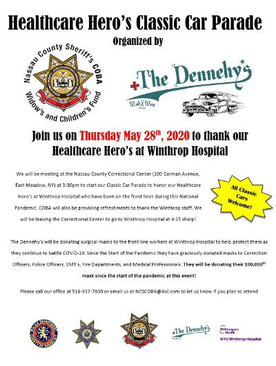 COBA and the Widows and Childrens Fund will be conducting a Healthcare Hero's Classic Car Parade and Drive By of Winthrop Hospital this coming Thursday May 28th. We will be mustering at the Jail starting at 3:30pm and leaving for Winthrop at 4:15pm sharp. The Nassau County Police Dept will be providing an escort on our route from the Jail to Winthrop. Ed Dennehy and his crew from Mad Men will be donating masks to the staff at Winthrop and we will be providing refreshments to the staff there. We invite all to attend, especially all those with Classic Cars. We will also have Sheriffs Dept vehicles in the procession.