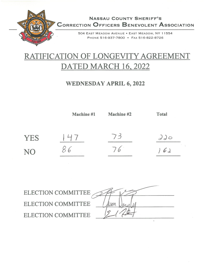 Nassau COBA, PBA, SOA, & CSEA have now all Ratified the Longevity Agreement. Results from the DAI Ratification are expected Friday. The Longevity Agreement will now move on the the Nassau County Legislature for approval.
