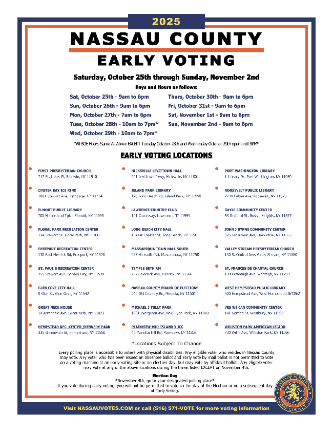 Early Voting will be taking place Saturday Oct. 25th thru Sunday Nov. 2nd, 2025 at various locations please see flyer below
