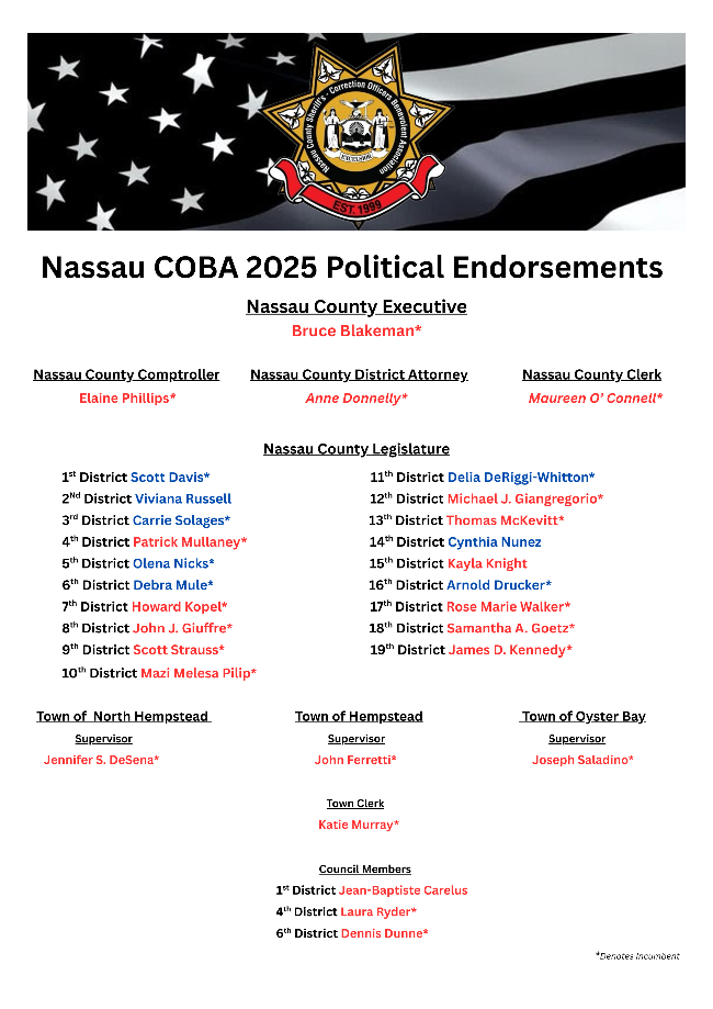 For the 2025 Election Screening Process, members of your COBA Executive Board contacted the candidates running to represent Nassau County Residents on all levels of local government.