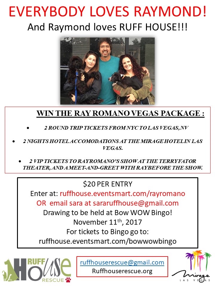 Ray's brother adopted from us and Ray graciously donated an auction package - two round trip tickets to Vegas, a two night stay at The Mirage, tickets to see his show and even a meet and greet with him. Only 1,000 tickets sold, $20 per entry.